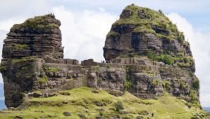 The Apurímac River Canyon far below makes the high promontory even more dramatic. The ruins are at 4,140 meters above sea level (13,583 feet) and the river is at about 3,230 meters (10,600 ft). I think the location is much more impressive than Machu Picchu. …